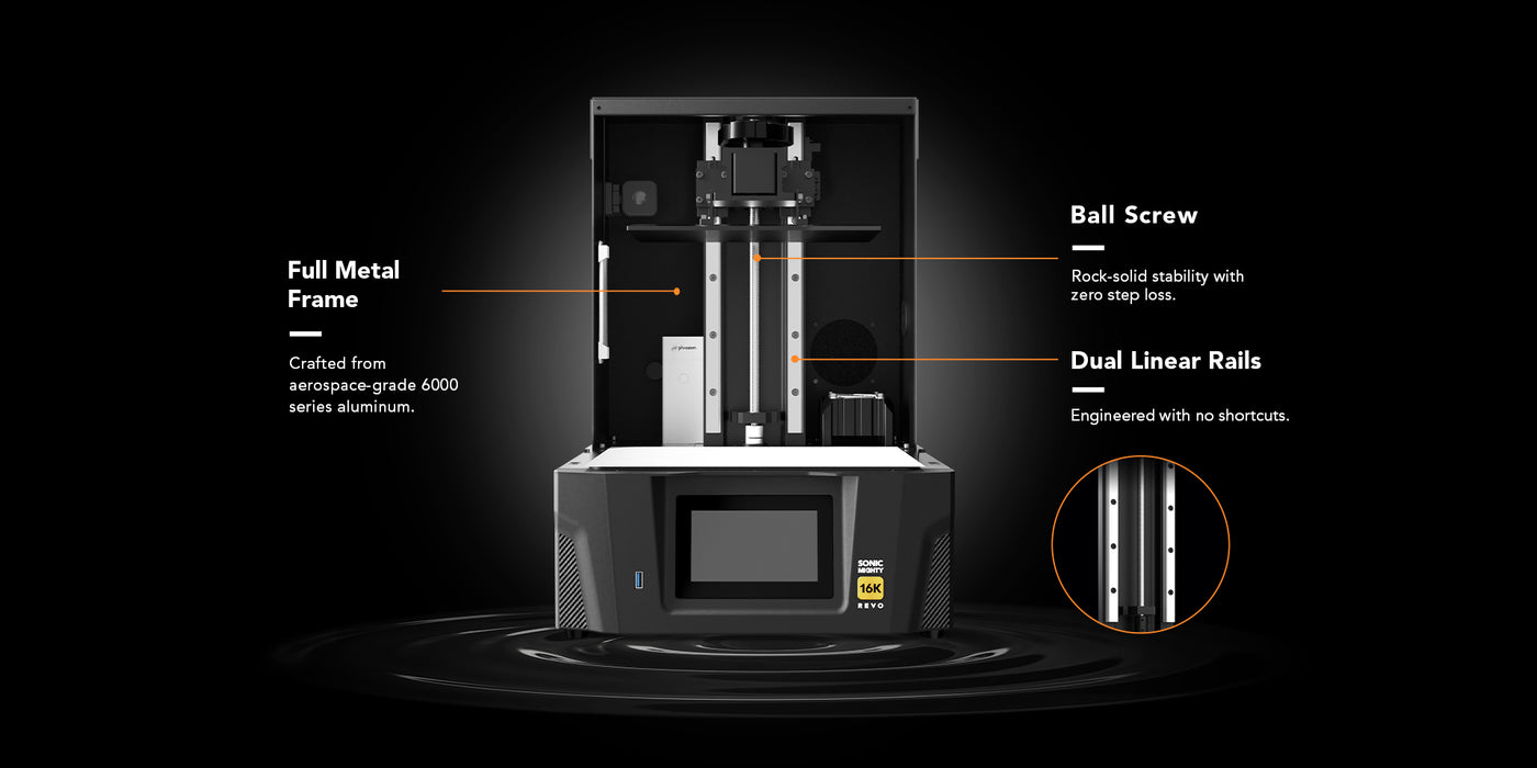 The Revo 16K is built for users who require the highest possible level of detail and dimensional accuracy. Its ultra-high-resolution LCD, rigid all-metal frame, and precision motion system allow it to produce exceptionally sharp features, smooth surfaces, and consistent results across the entire build area.